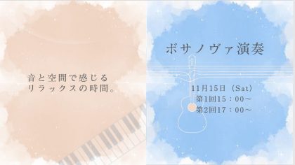 =ボサノヴァ演奏会開催。音と空間で感じるリラックスの時間=【日時】11月15日(土曜日)【時間】①15:00~ ②17:00~【演奏者】鈴木 美也子(ボサノヴァギター弾き語り) 永見 行崇(ピアニスト)【参加費】無料*詳細とご予約はお電話にてお願いします。&nbs...