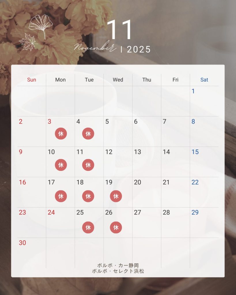 *11月19日(水)定休日、11月24日(月)祝日は営業のため、26日(水)が休業となります。