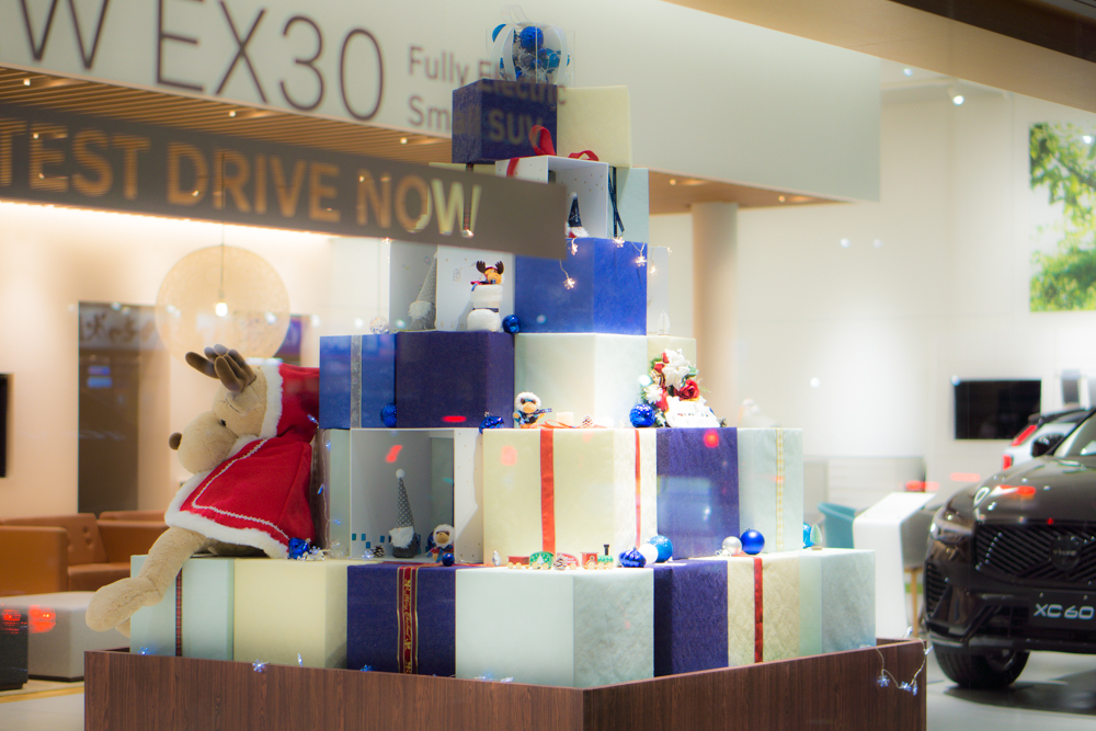 ボルボらしい深いブルーを基調に、大小さまざまなギフトボックスを重ねたツリーは、北欧の静かな冬のあたたかさをイメージしています。
